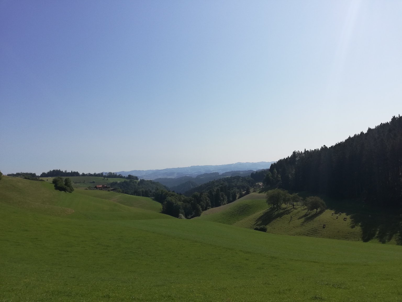Wir gingen relativ früh los, da es heute ziemlich warm werden sollte. Bereits nach ein paar wenigen Minuten ging es rasant nach oben. Von 583m bis nach Mänziwilegg, welches auf 917m liegt. Dafür wurden wir schon kurz nach dem Start mit tollen Aussichten belohnt. Grüne Landschaften, hügeliges Gelände und tolle Ausblicke auf die Alpen und den Jura. Tendenziell geht die erste Hälfte immer ziemlich nach oben und wir gewannen schnell an Höhe.