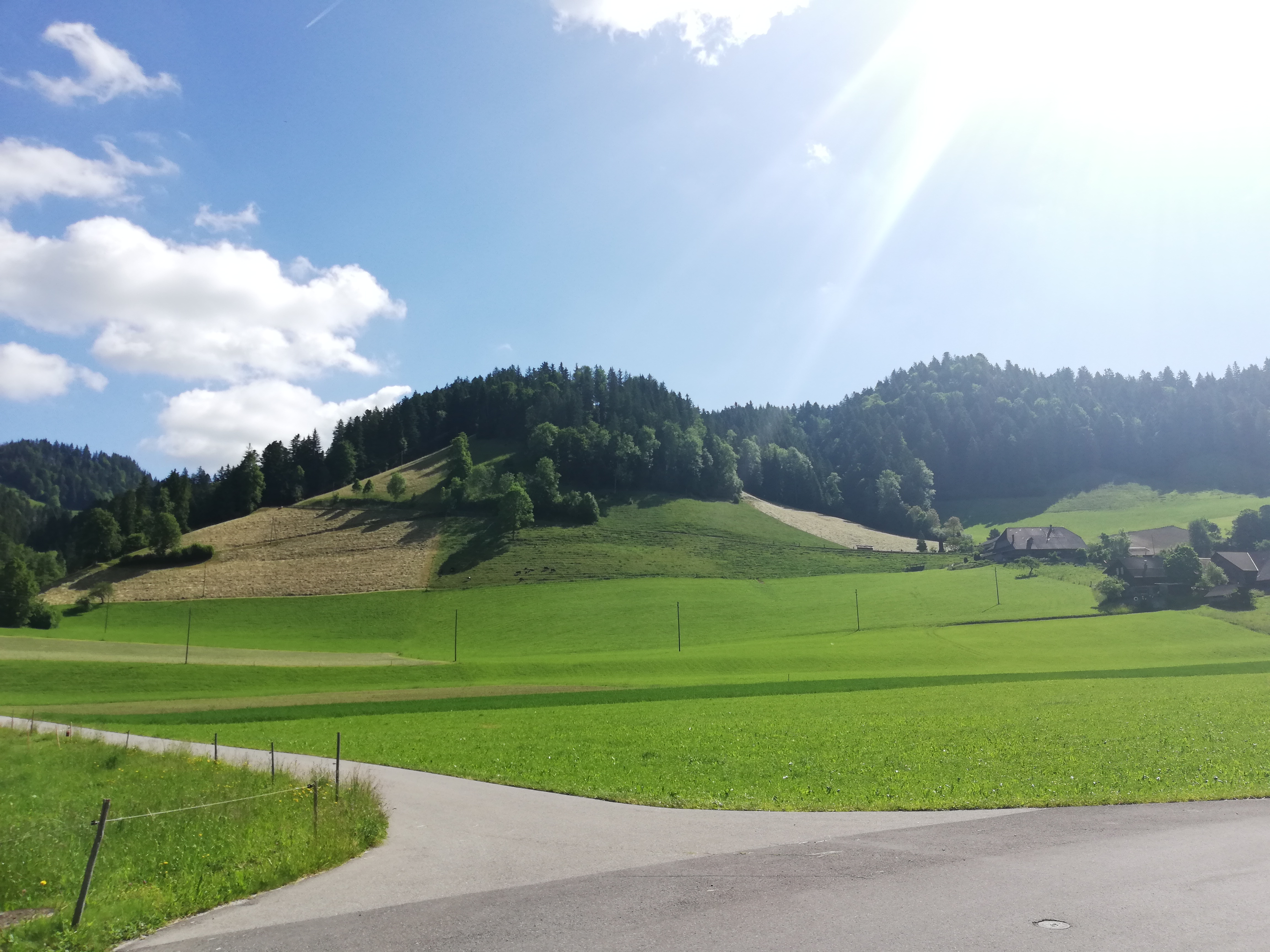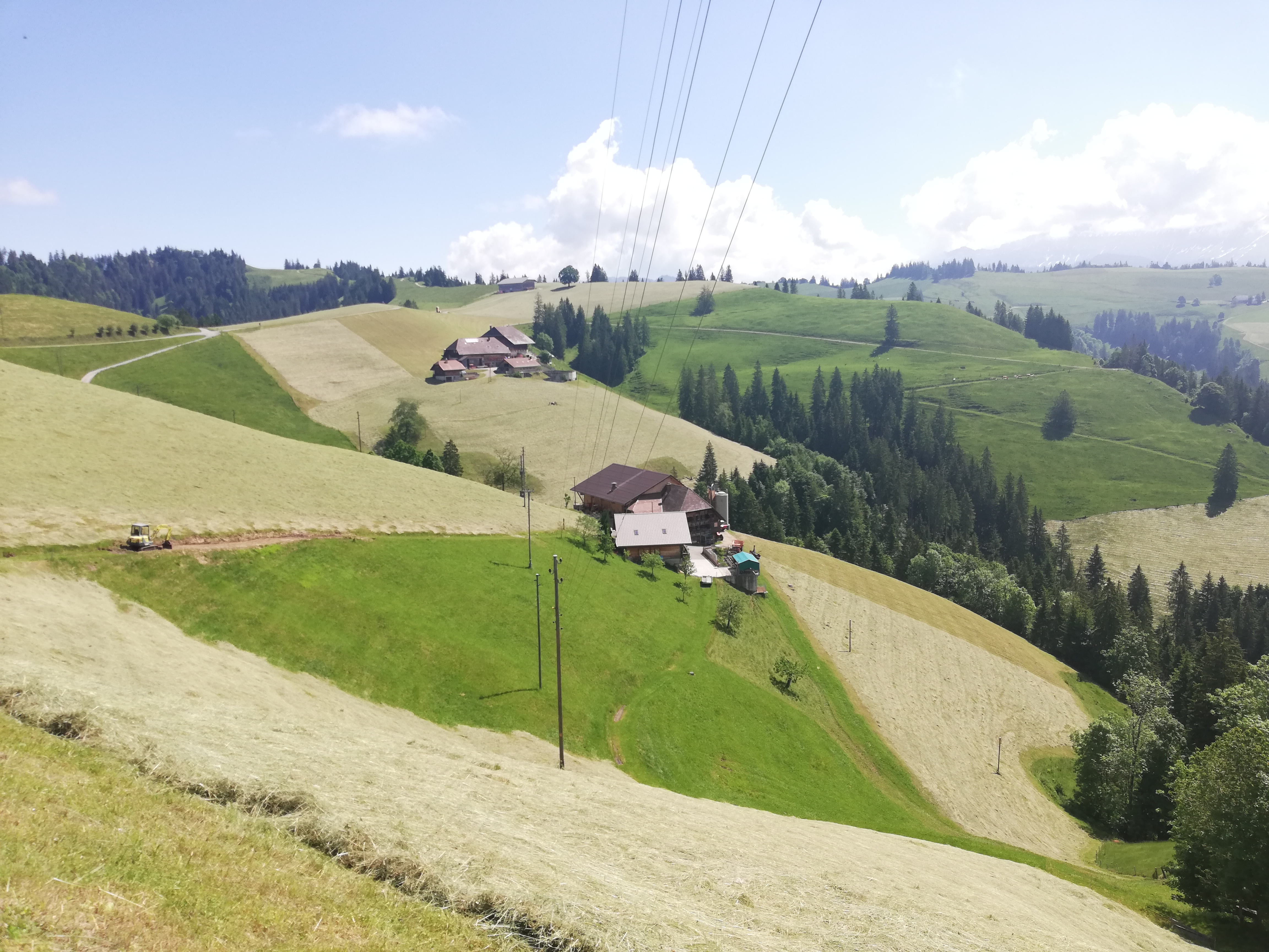 Glücklicherweise waren alle gerade am Heuen. So hatte ich zu der tollen Aussicht auch ständig einen leckeren Heu-Duft in der Nase. Und, noch besser, keine Kühe auf den Wiesen. Denn die Wege liessen erahnen, dass mir unterwegs so manche Kuh hätte begegnen können.