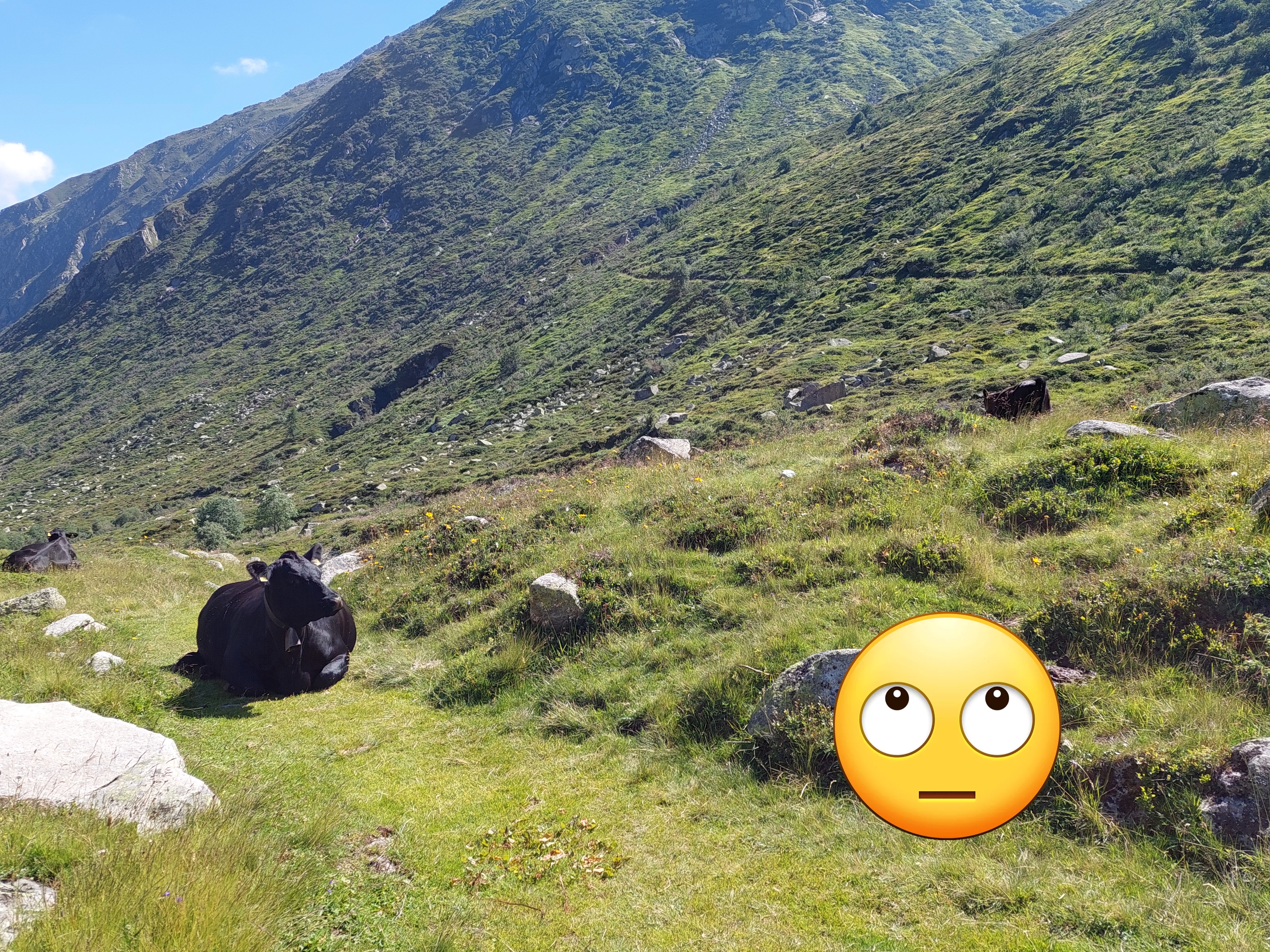 Leider hatte es ebenfalls eine Gruppe Kühen mit Jungen. Mitten auf dem Weg. Da rutschte mir das Herz so richtig in die Hosen. Wir machten zur Sicherheit einen Bogen um die Kühe und ich war froh, als wir dieses Stück passiert hatten. (Übrigens tat es uns ein weiterer Wanderer gleich und nahm ebenfalls einen etwas grösseren Bogen)