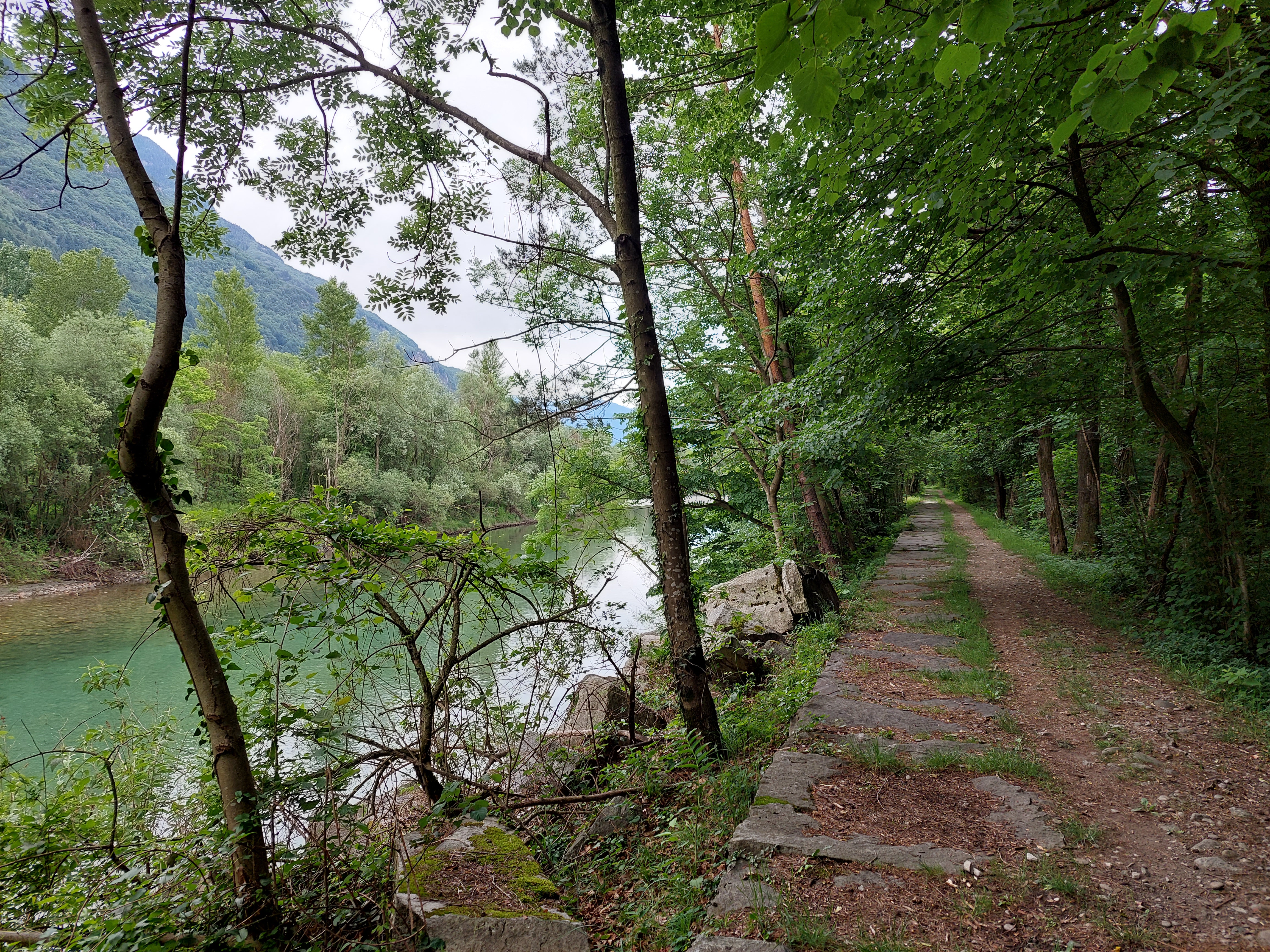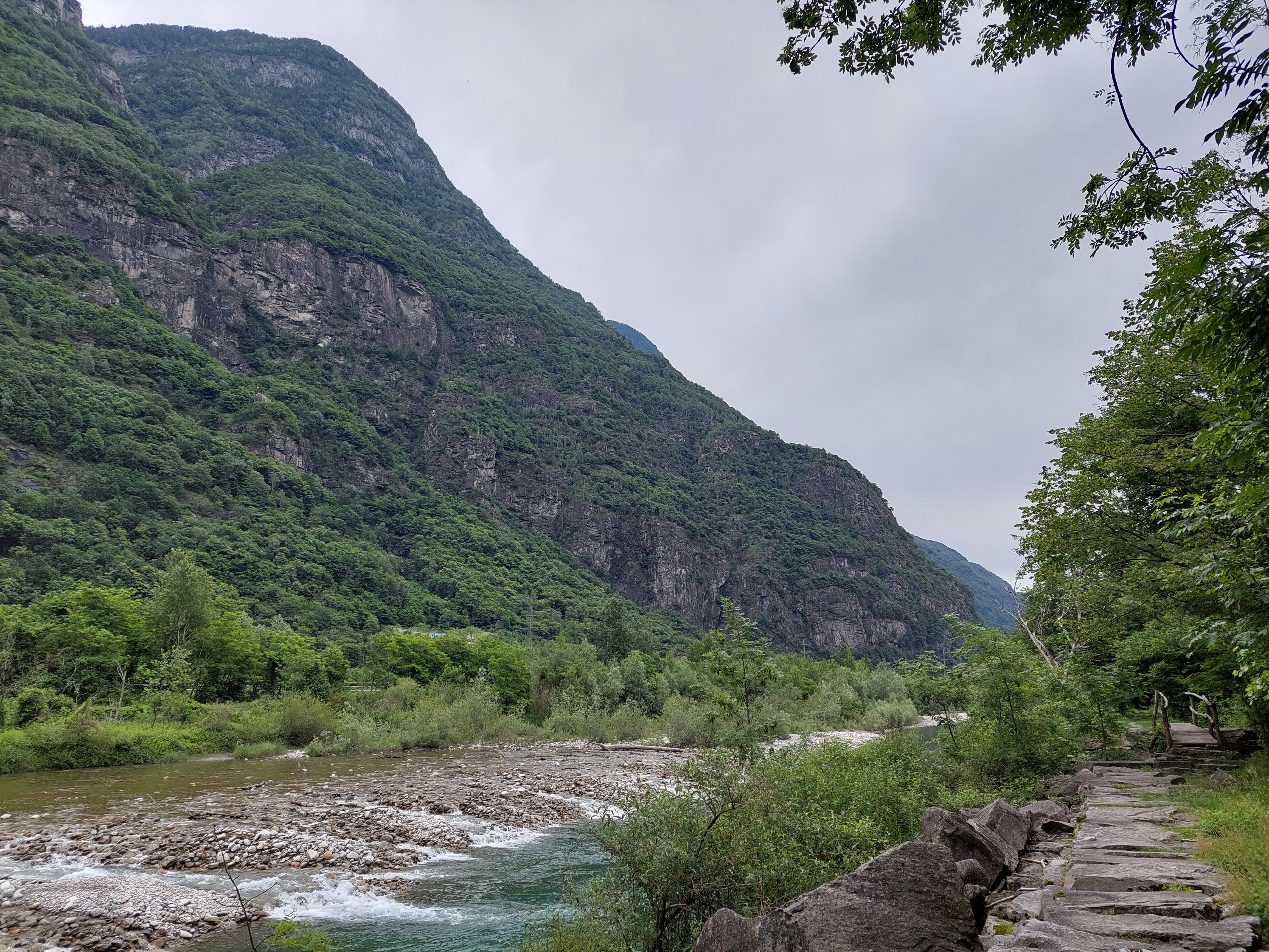 Die ersten ca 2km lief ich an der Hauptstrasse entlang, nicht sonderlich schön. Irgendwann führte der Weg nach links ab, ans Ufer. Von dort an ging der Weg erst auf riesigen Granitsteinen entlang am Sentiero Riviera. Eine schöne Strecke entlang dem Fluss.