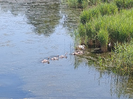 Weiter führte der Weg alles am Ufer entlang. Besonders faszinierend war, wie viele verschiedene (Wasser-)Vögel man am und im Wasser entdeckte. Besonders angetan hatten es mir die etlichen Schwäne mit ihren Jungen, auch wenn ich sehr gerne Abstand zu diesen Tieren wahre.