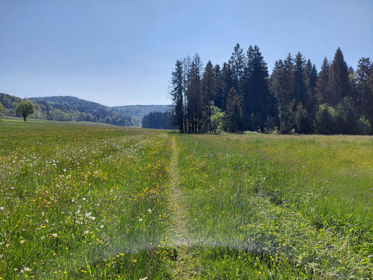 Danach führte mich der Weg weiter durch saftige Wiesen und Weiden bis dann der Weg sich senkt und mich bis an mein erstes Etappenziel Tramelan führte.